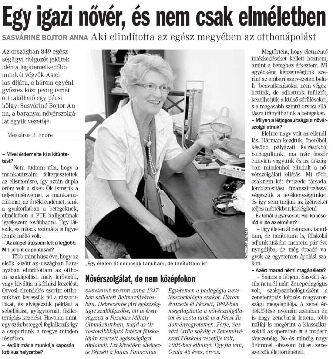 Az országban 849 egészségügyi dolgozót jelöltek idén a legkiemelkedőbb munkát végzők Astellas- díjára, a három egyéni győztes közt pedig ismét ott található egy pécsi hölgy: Sasváriné Bojtor Anna, a baranyai nővérszolgálat egyik vezetője.